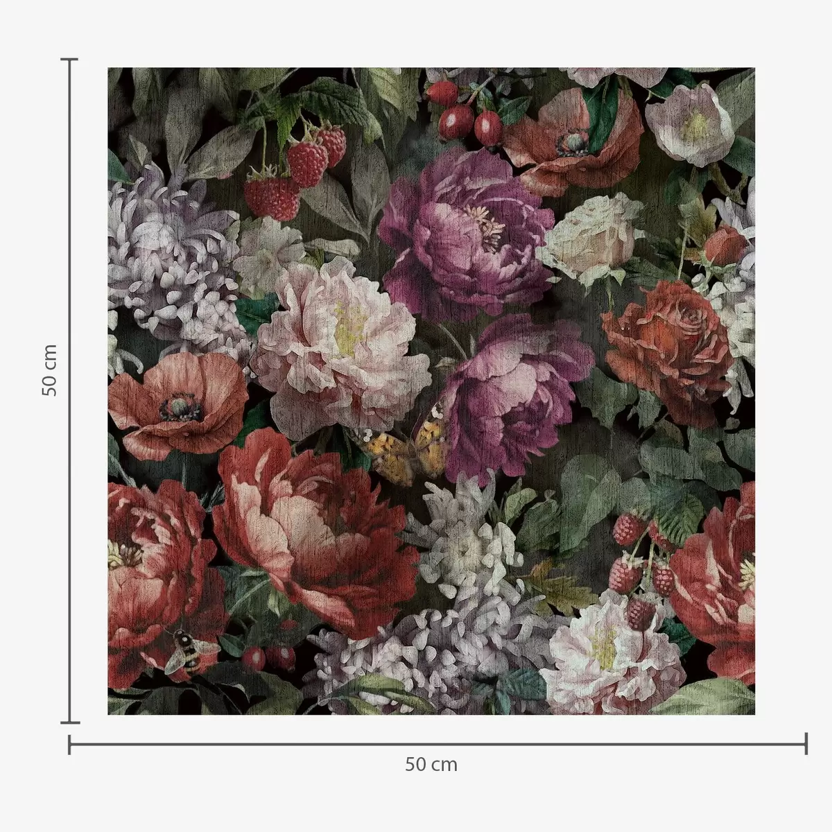 Tapeta Tmavé dramatické pivoňky, bobule a motýl na černém pozadí Nr. a00862