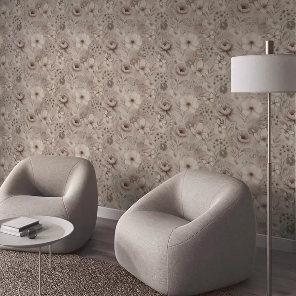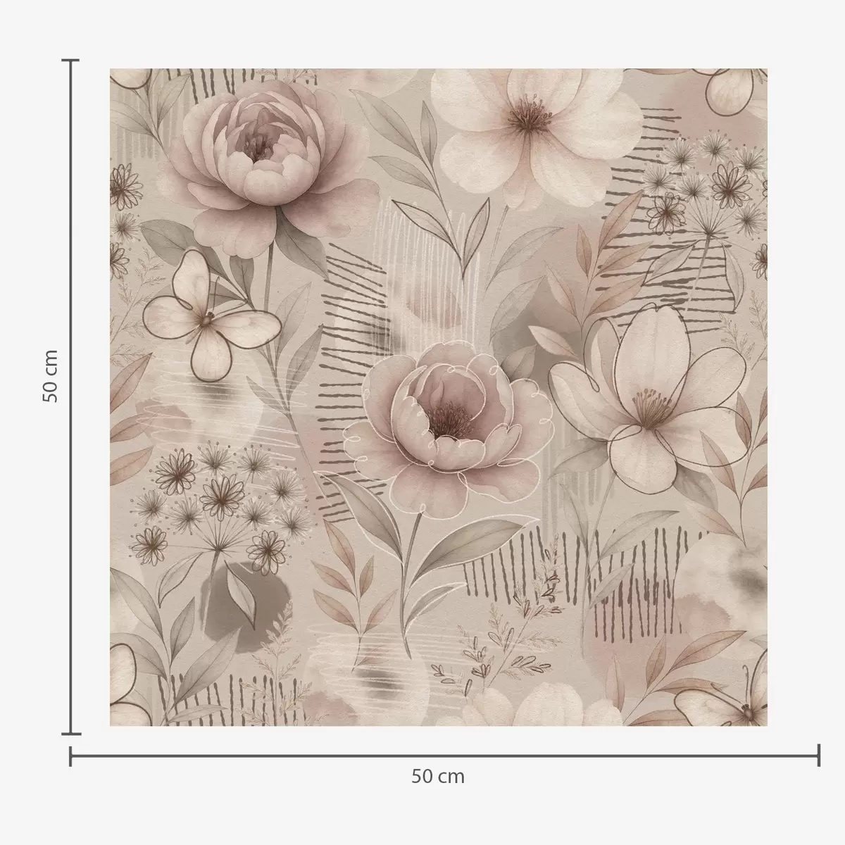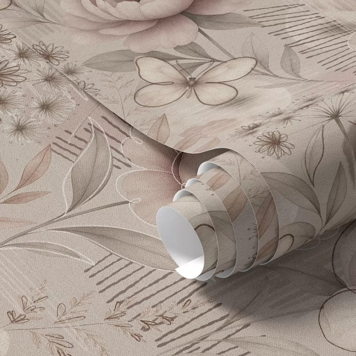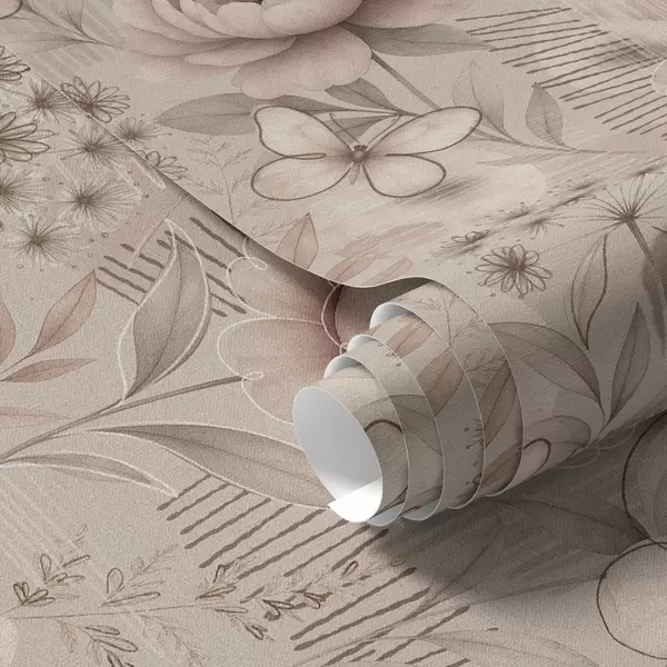 Tapeta Sépie béžové květinové vzory s motýly a lineárními akcenty Nr. a00870
