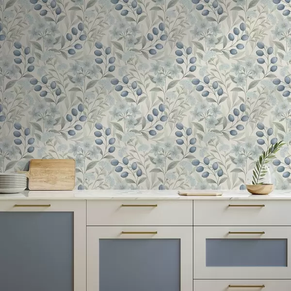 Tapeta Modré bobule a světlé květy na slonovině Nr. a00872
