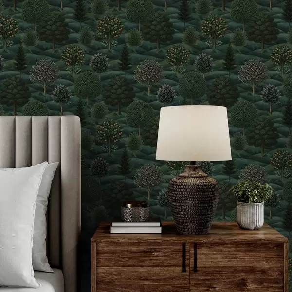 Tapeta Bohatá zelená kopcovitá krajina se vzorovanými stromy Nr. a00892