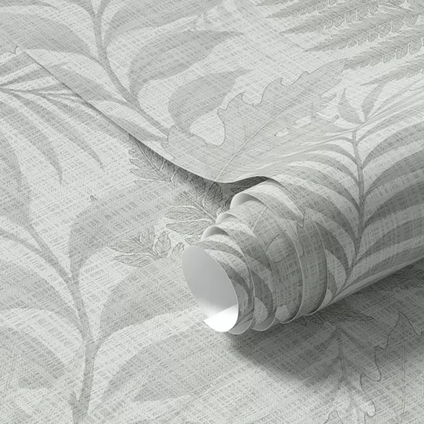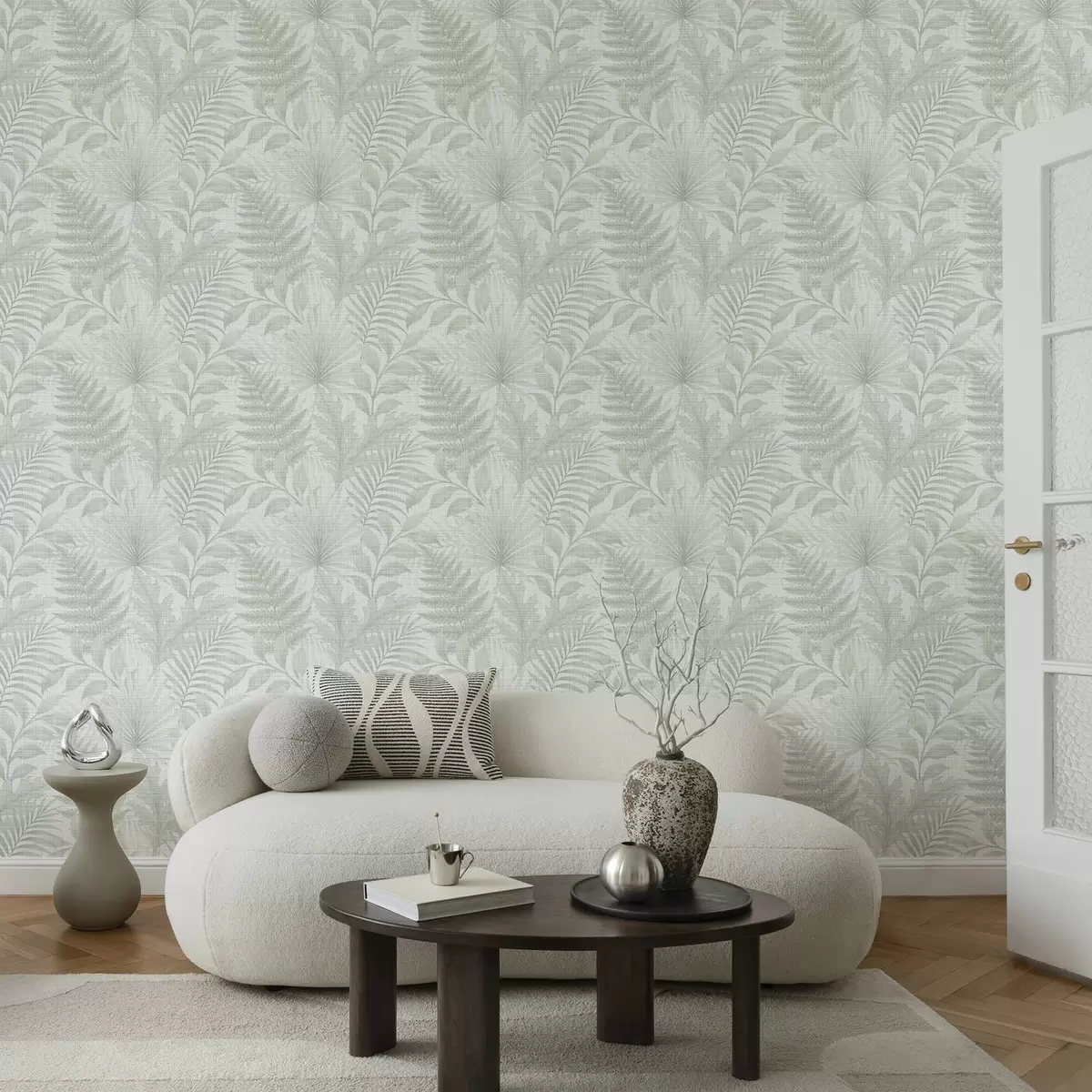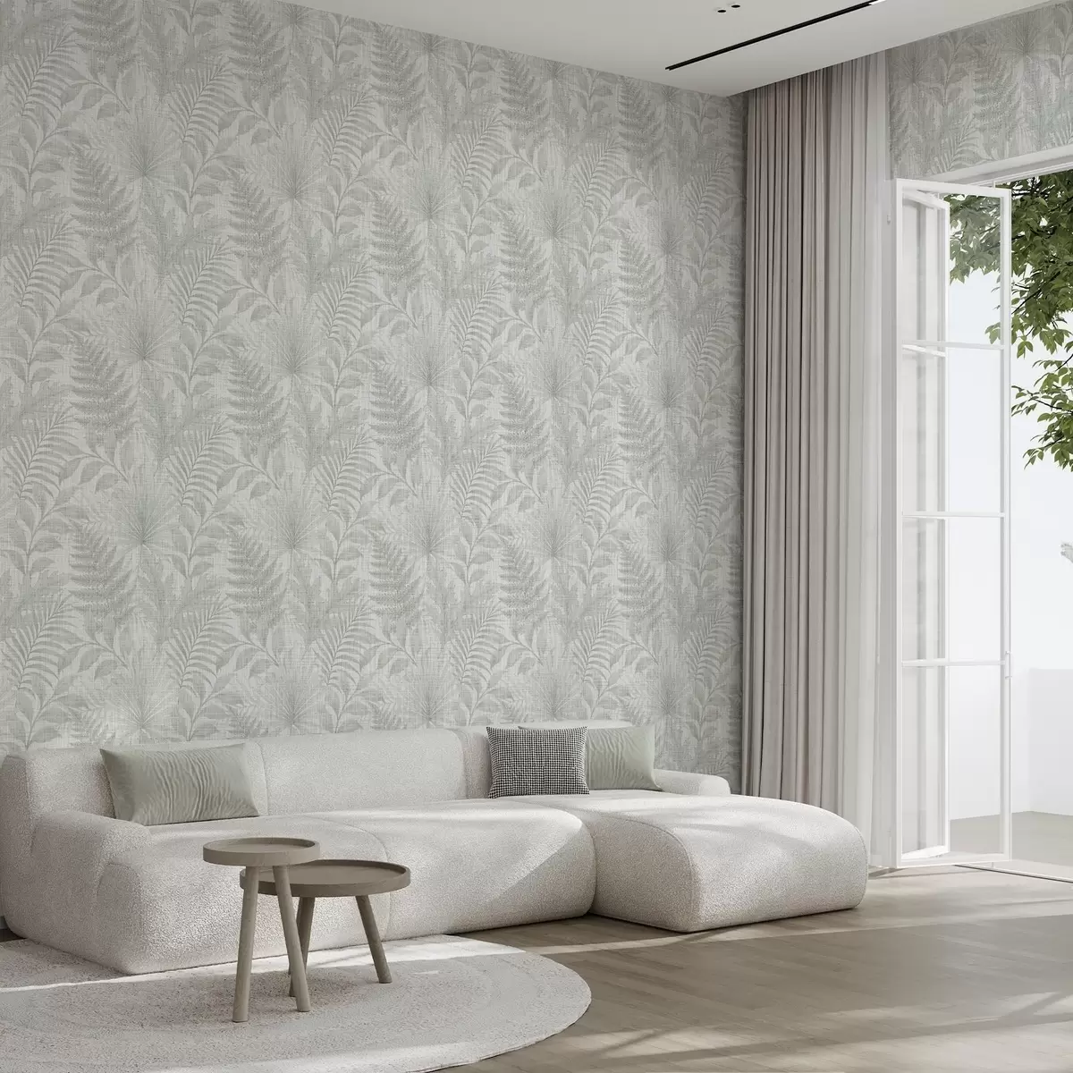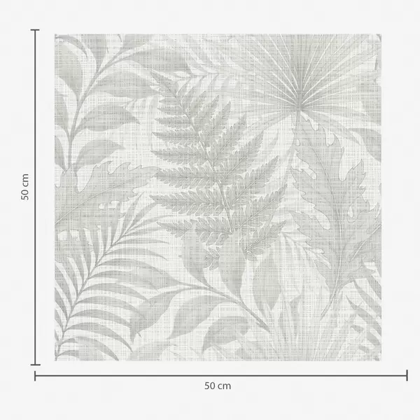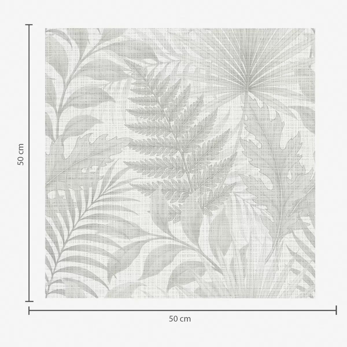Tapeta Měkké tropické listy v bledě šedé barvě na lněné textuře Nr. a00899
