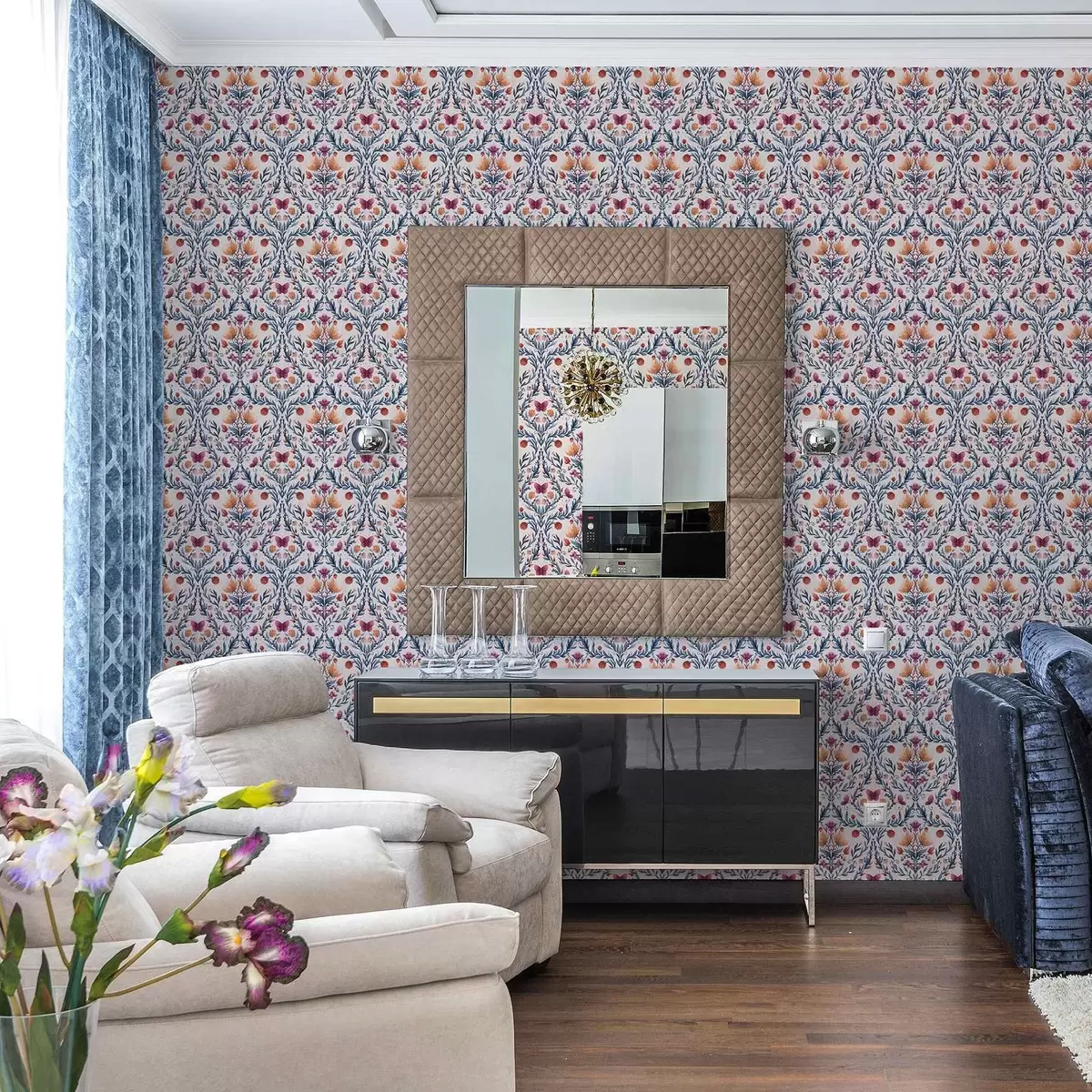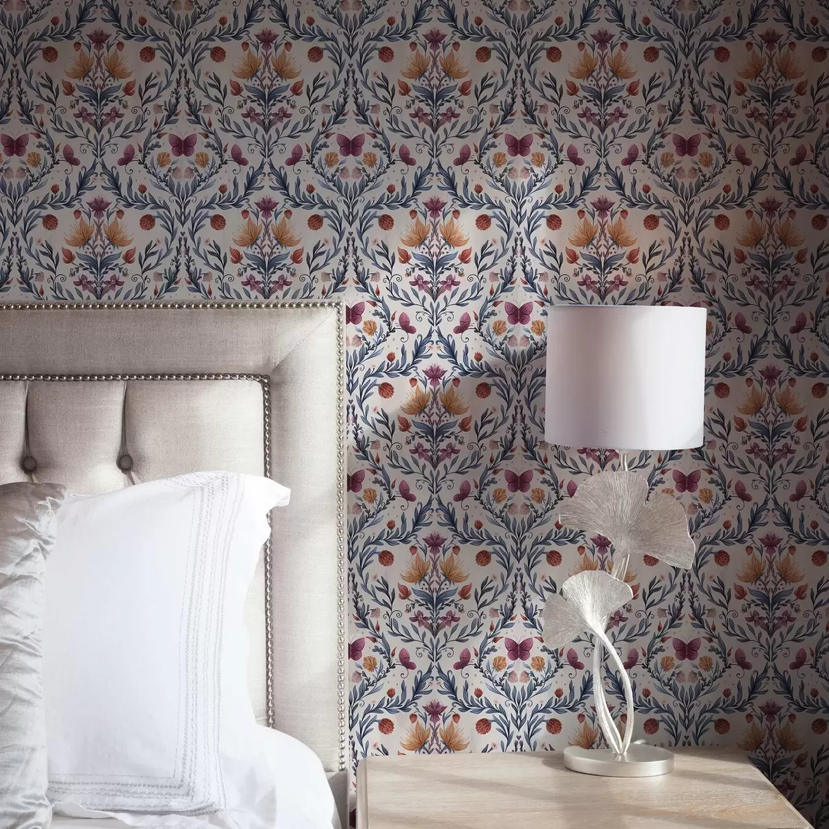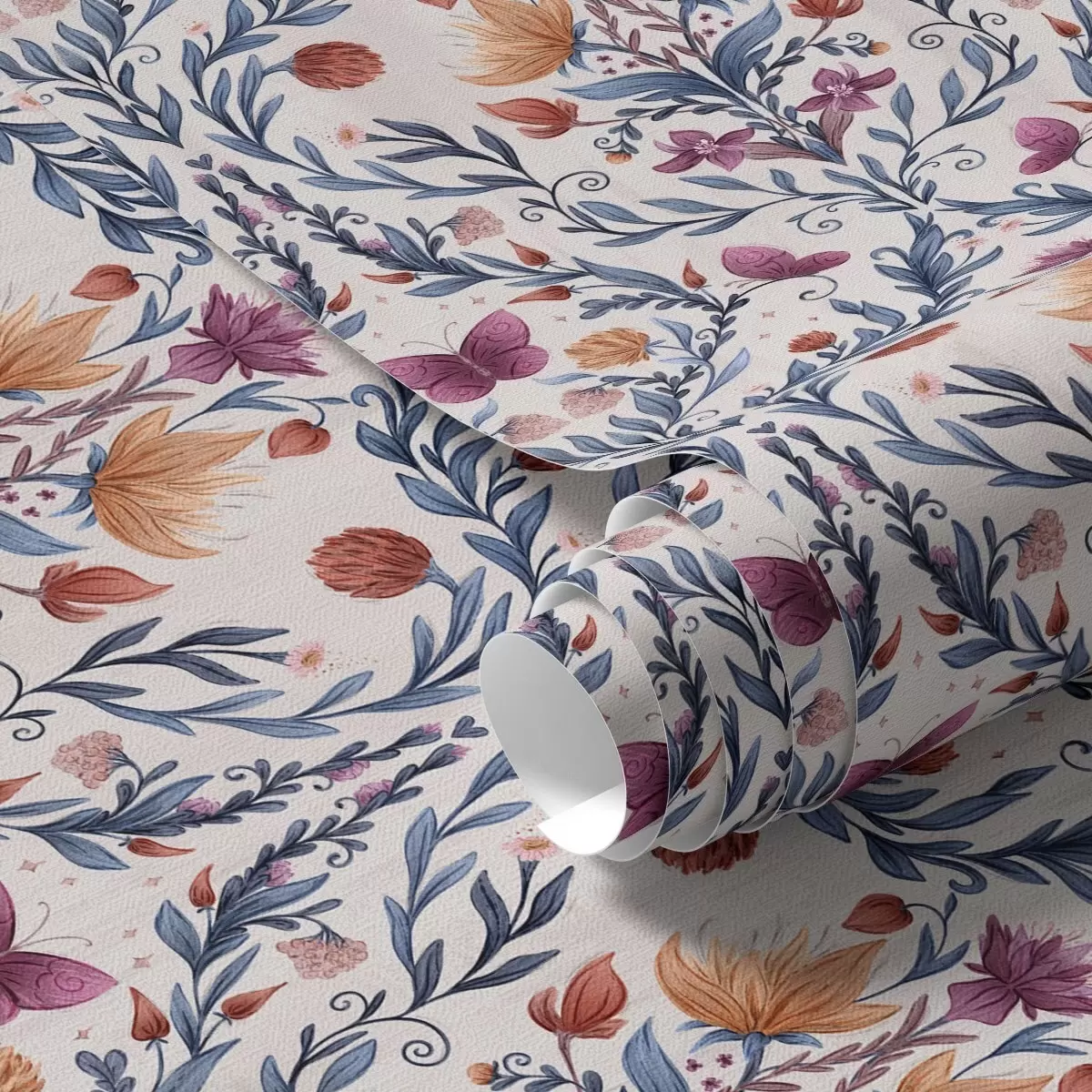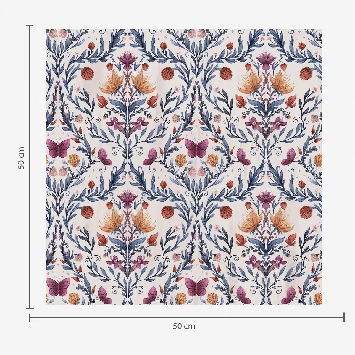 Tapeta Květinový damašek s motýly v tmavě modré a terakotové barvě na bílém podkladu Nr. a00926v1