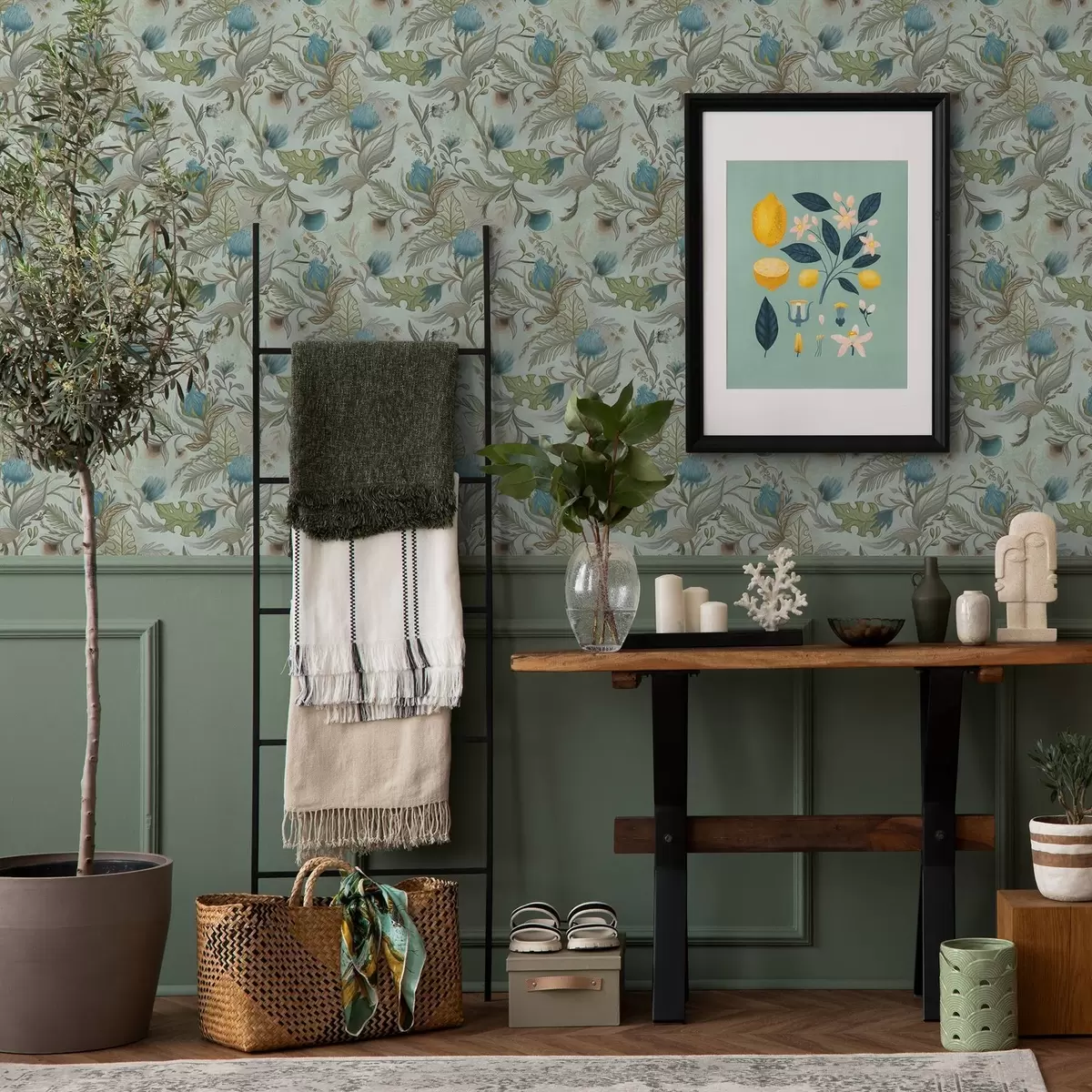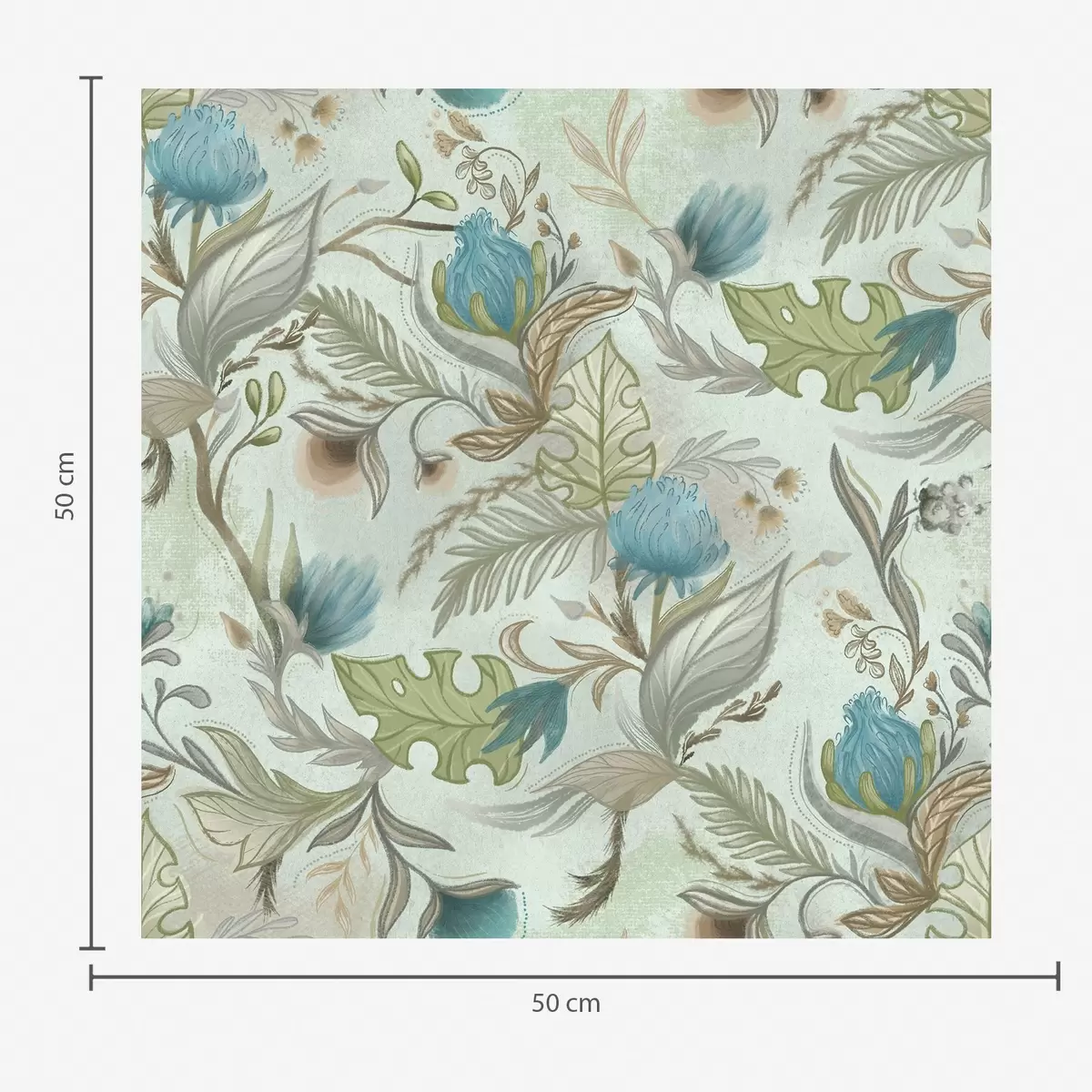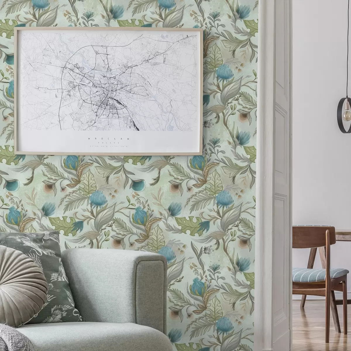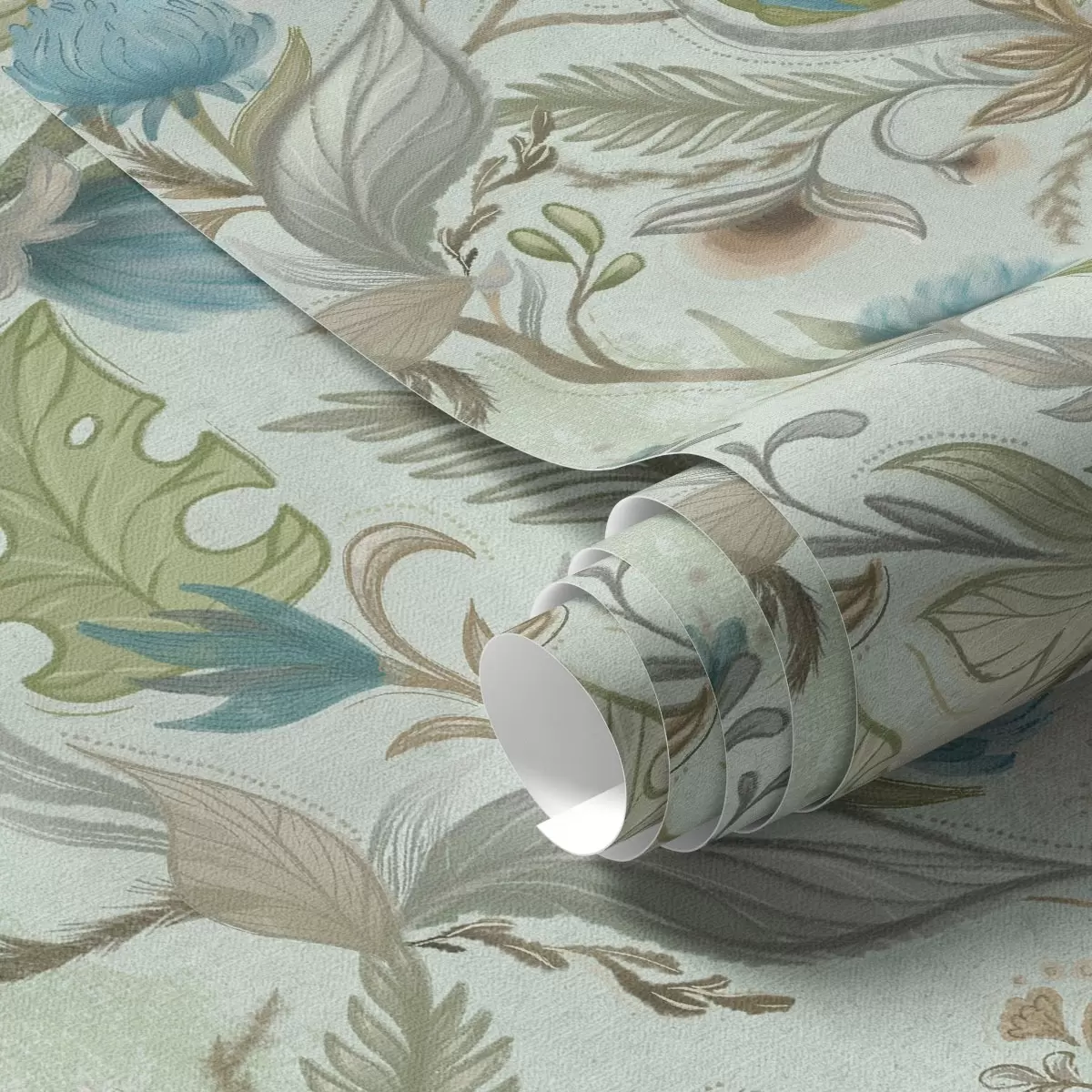 Tapeta Modré květy a zeleň na jemně mátovém pozadí Nr. a00930v1