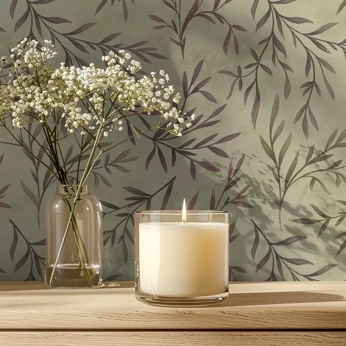Tapeta Lilacové a zelené větve s listy na teplém pozadí Nr. a00936v4