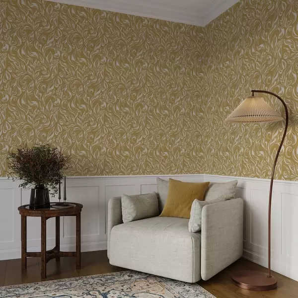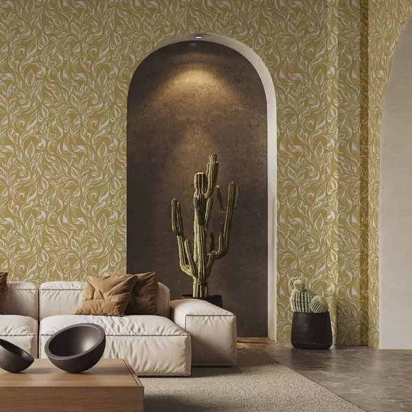 Tapeta Krémově bílý listový ornament na teplém okrovém pozadí Nr. a00940v1