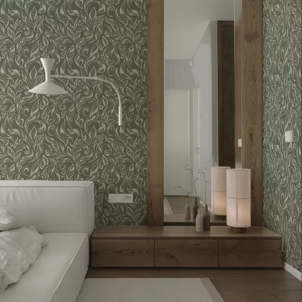 Tapeta Krémový listový ornament na zelenošedém pozadí Nr. a00940v2