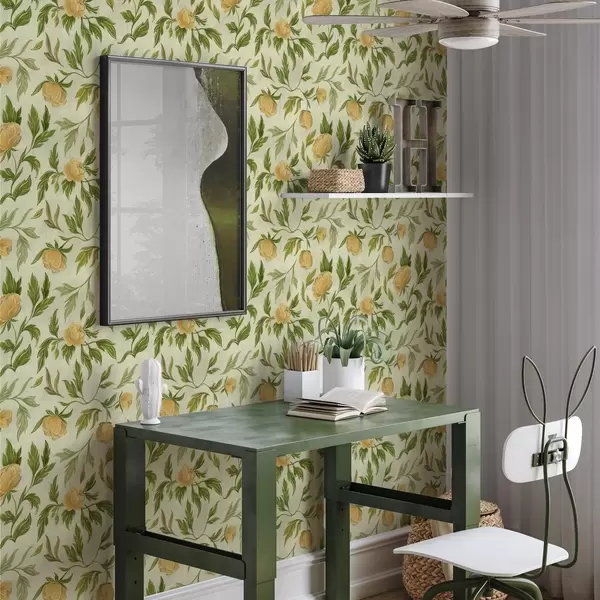 Tapeta Žluté pivoňky a listy na jemně světle zeleném pozadí Nr. a00942
