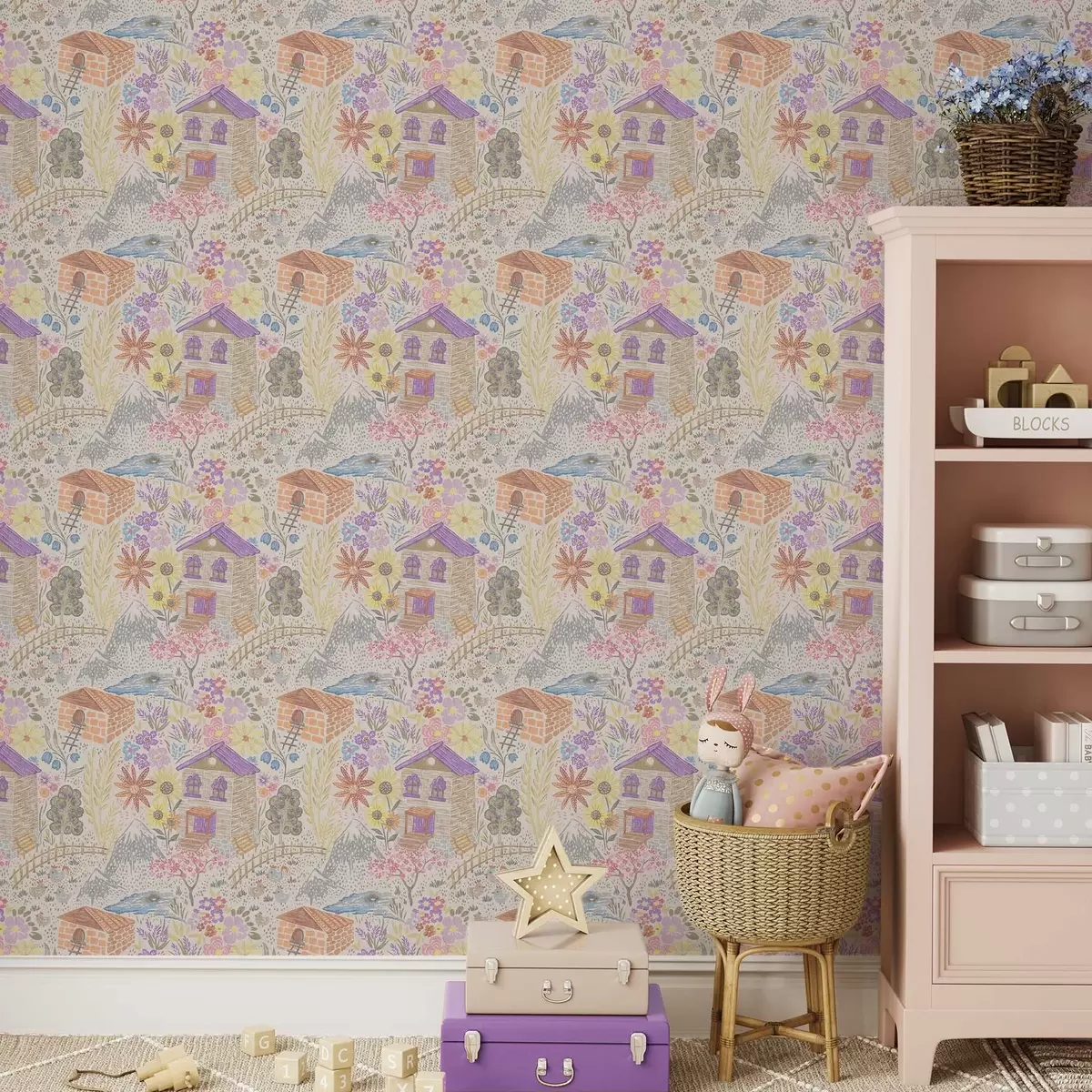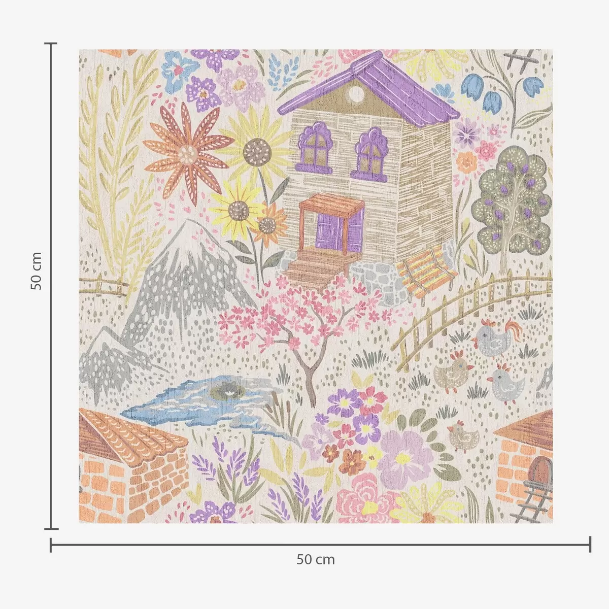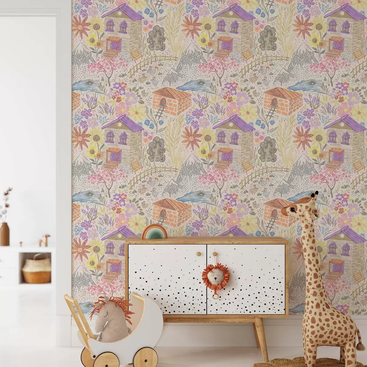 Tapeta Dětská kresba vesnice s domem, horami a květinami Nr. a00952