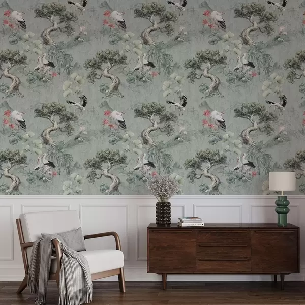 Tapeta Jeřábi mezi borovicemi a lotosy na klidném zeleném pozadí Nr. a00962