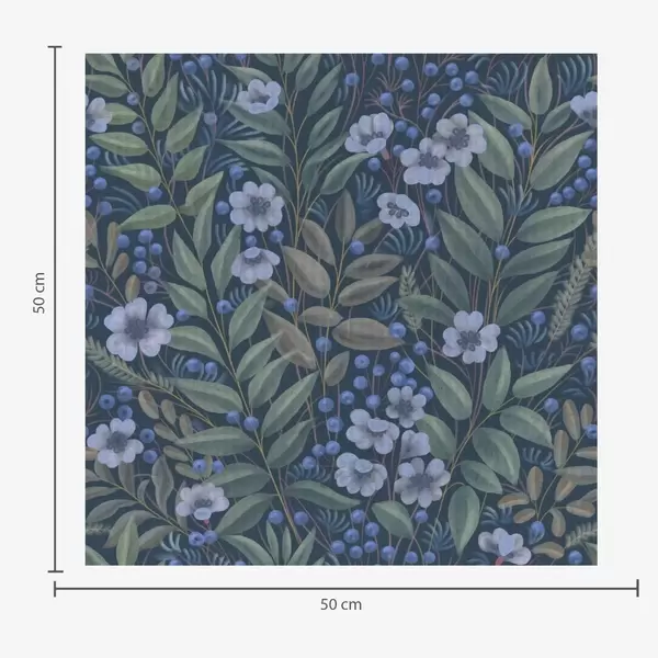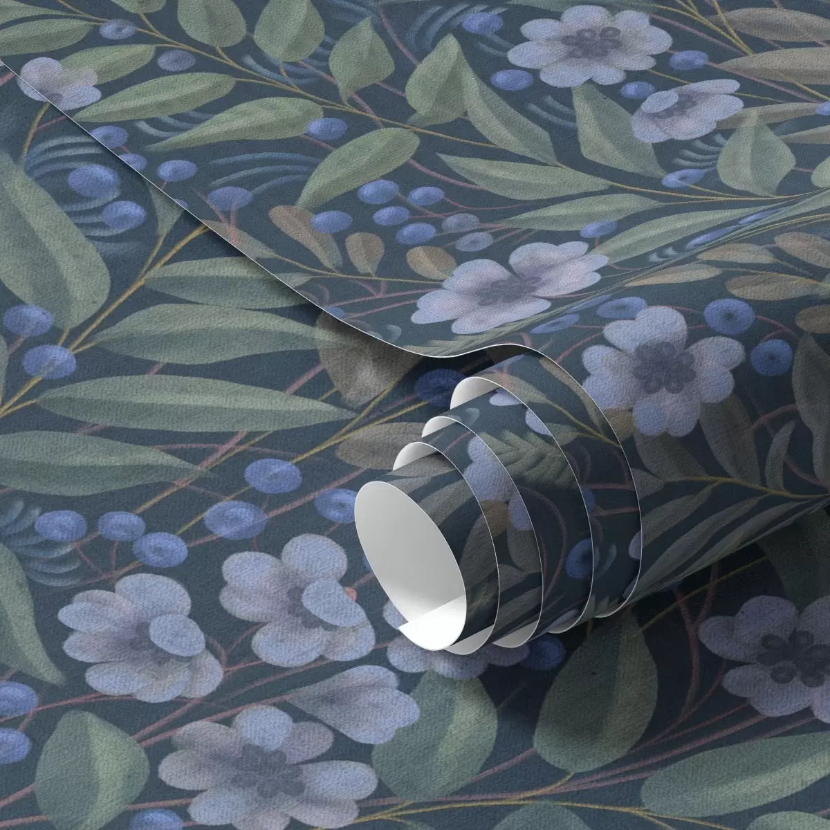 Tapeta Půlnočně modré bobule a bílé květy v hustém olistění Nr. a00994