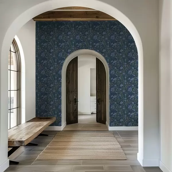 Tapeta Půlnočně modré bobule a bílé květy v hustém olistění Nr. a00994