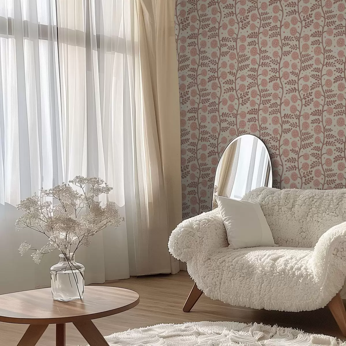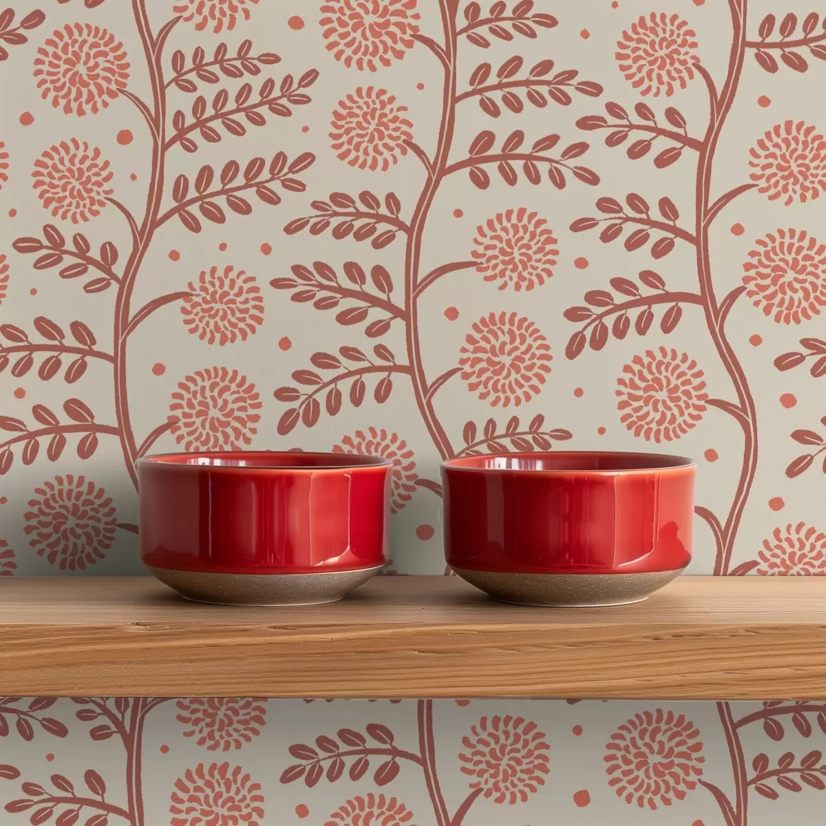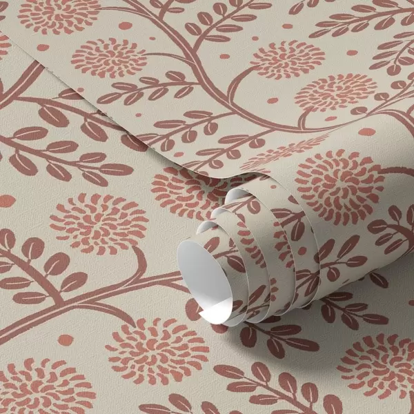 Tapeta Terakotové stonky s korálovými načechranými květy na krémovém pozadí Nr. a00997v1
