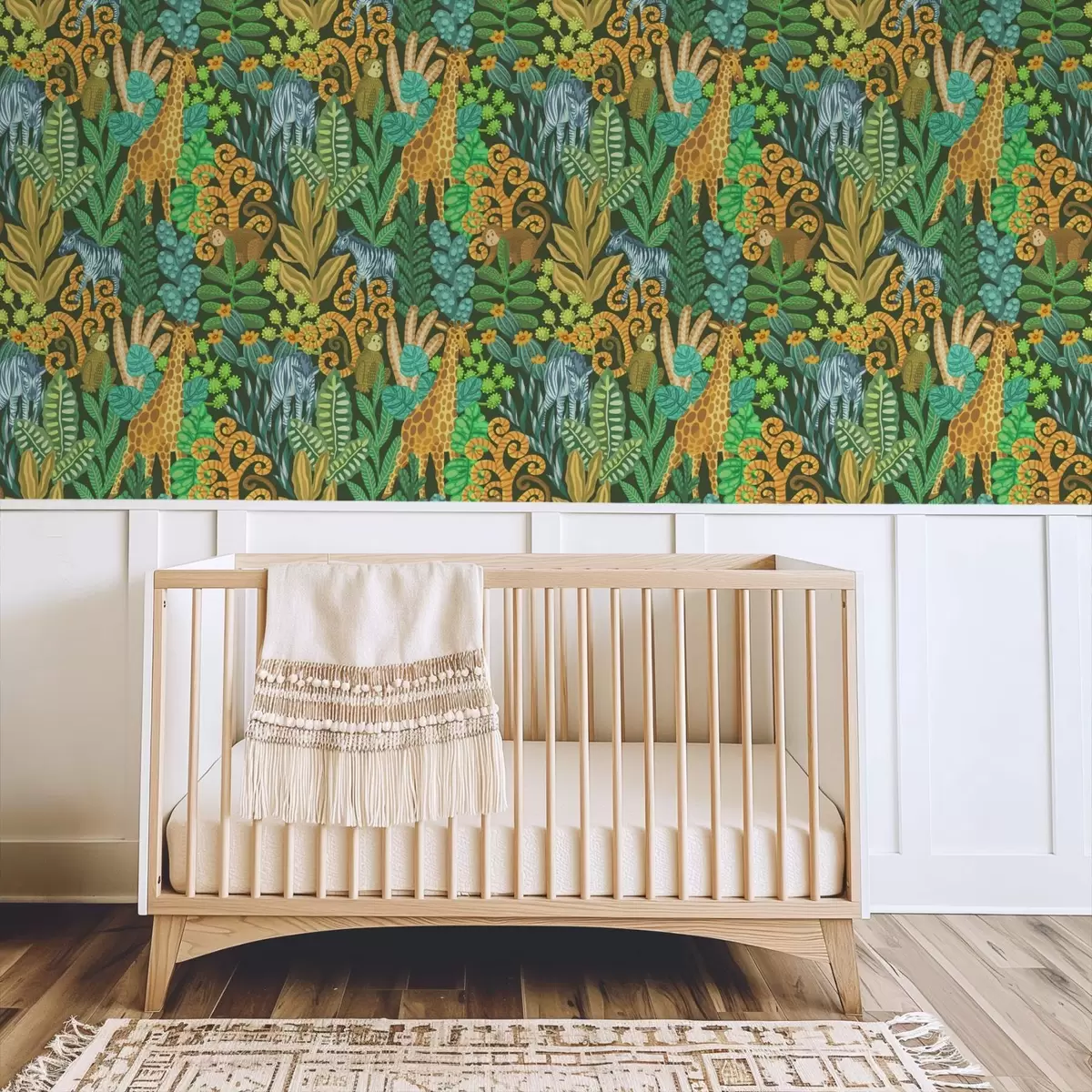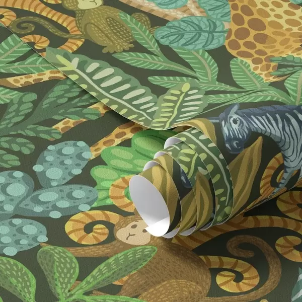 Tapeta Hustá džungle se zvířaty na tmavě zeleném pozadí Nr. a01000v2