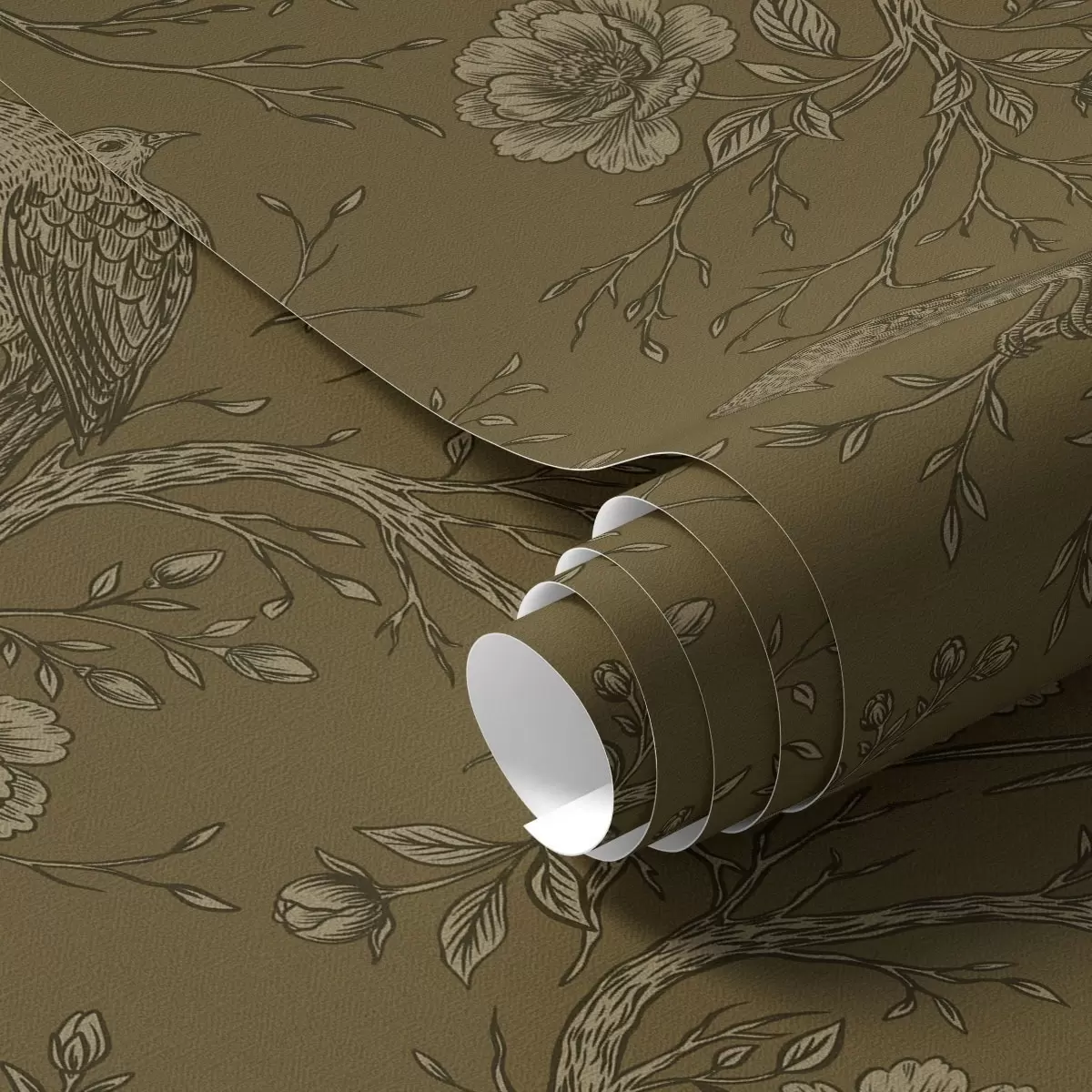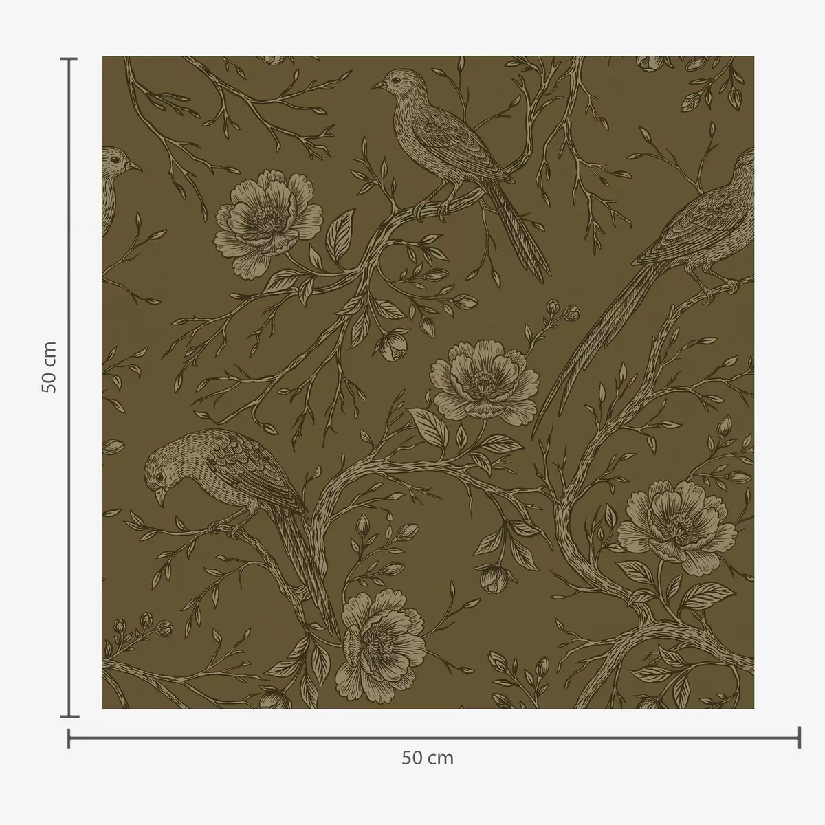 Tapeta Vintage ptáci a květiny na teplém olivovém pozadí Nr. a01022v1