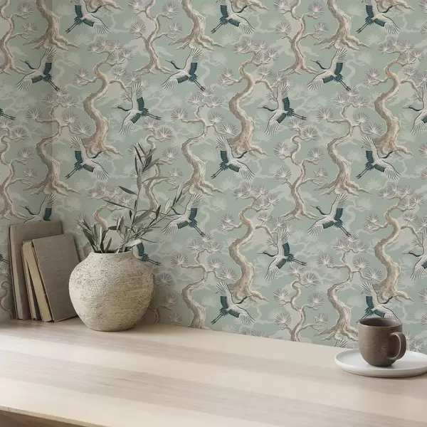 Tapeta Jeřábi mezi zakřivenými větvemi na jemném šalvějově zbarveném pozadí Nr. a01023