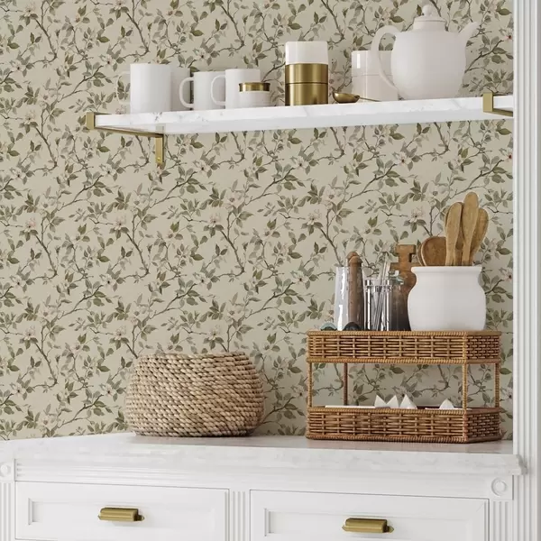 Tapeta Světlé větve s drobnými krémovými květy a zelenými listy Nr. a01028