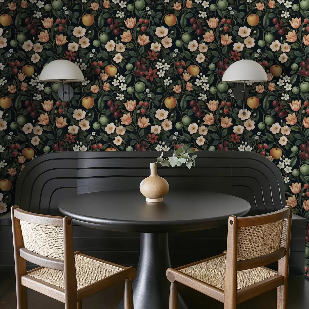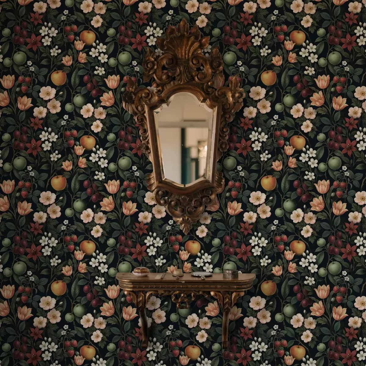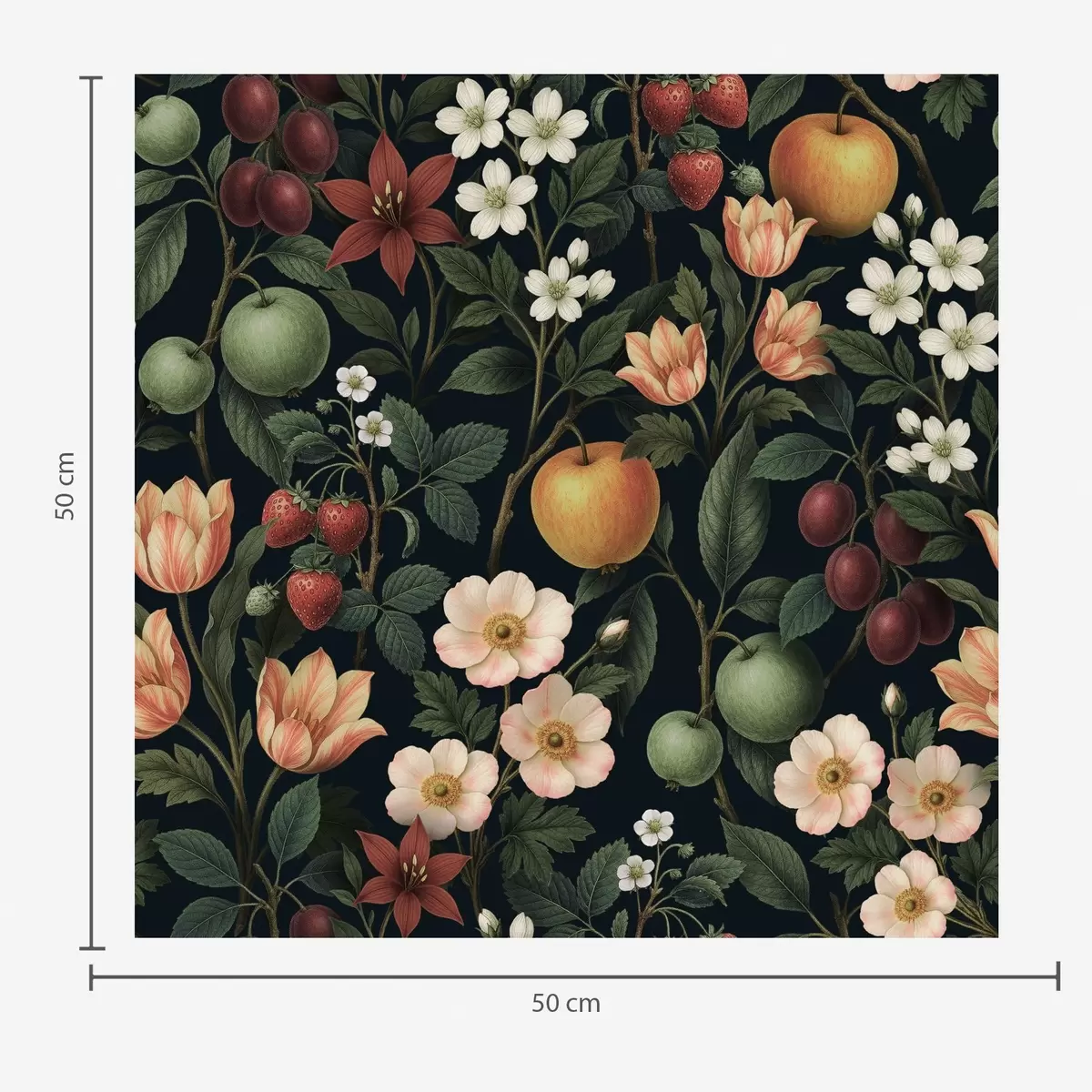 Tapeta Temná zahrada s květinami, zralými jablky a bobulemi Nr. a01034