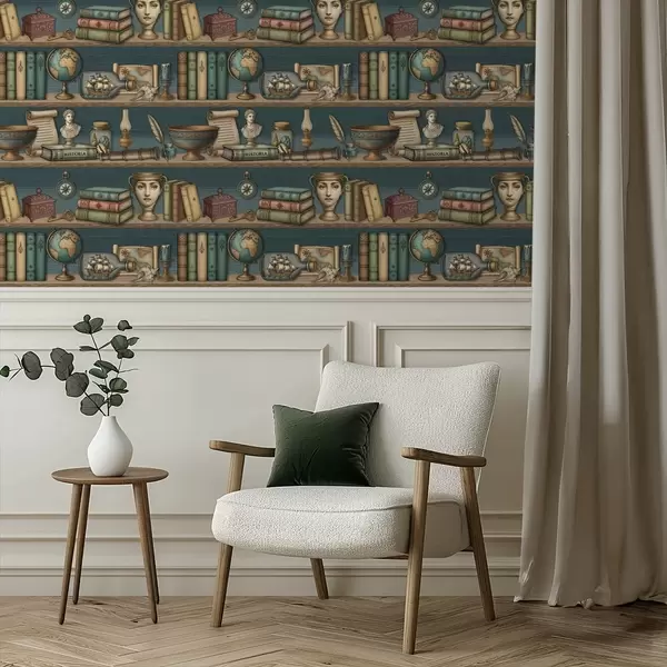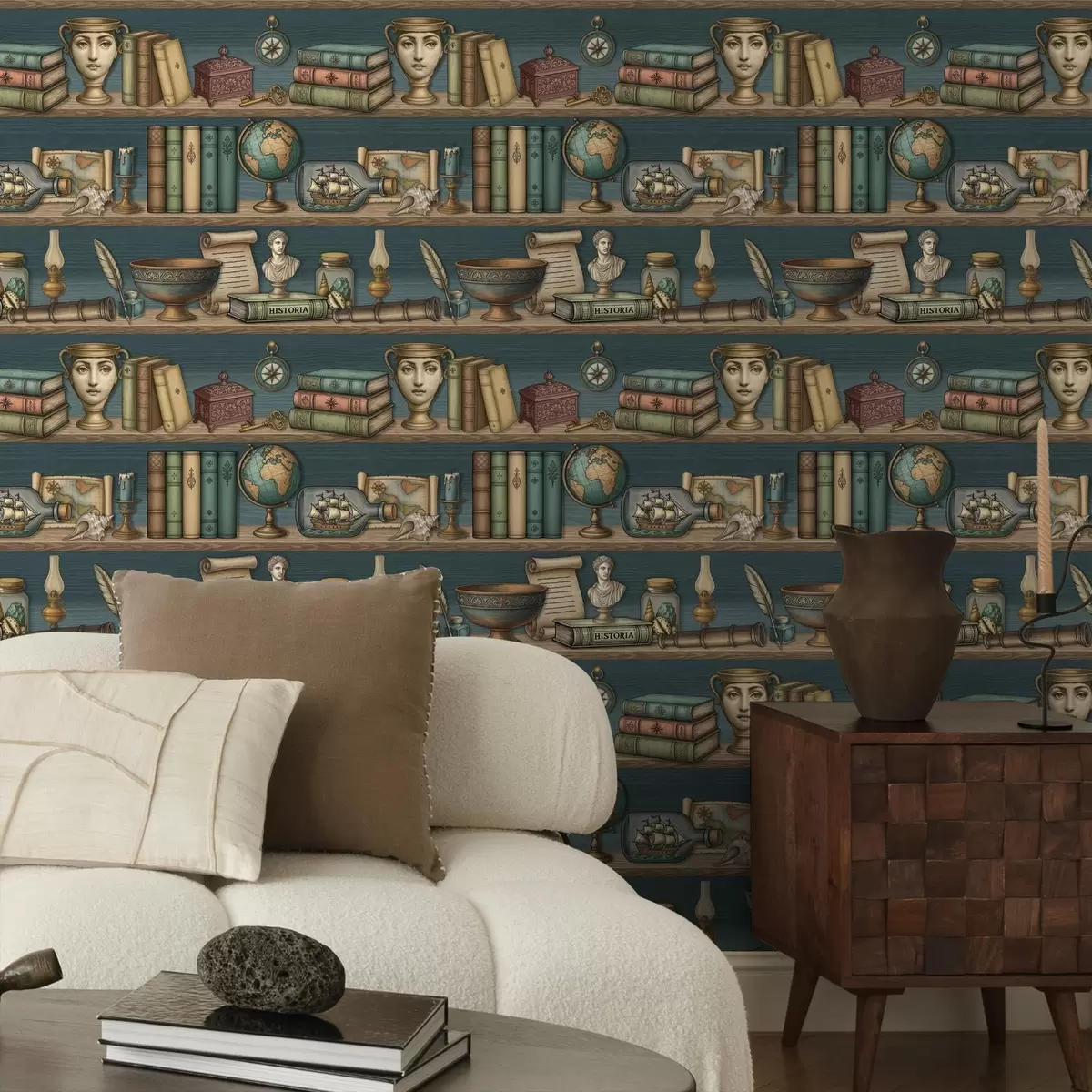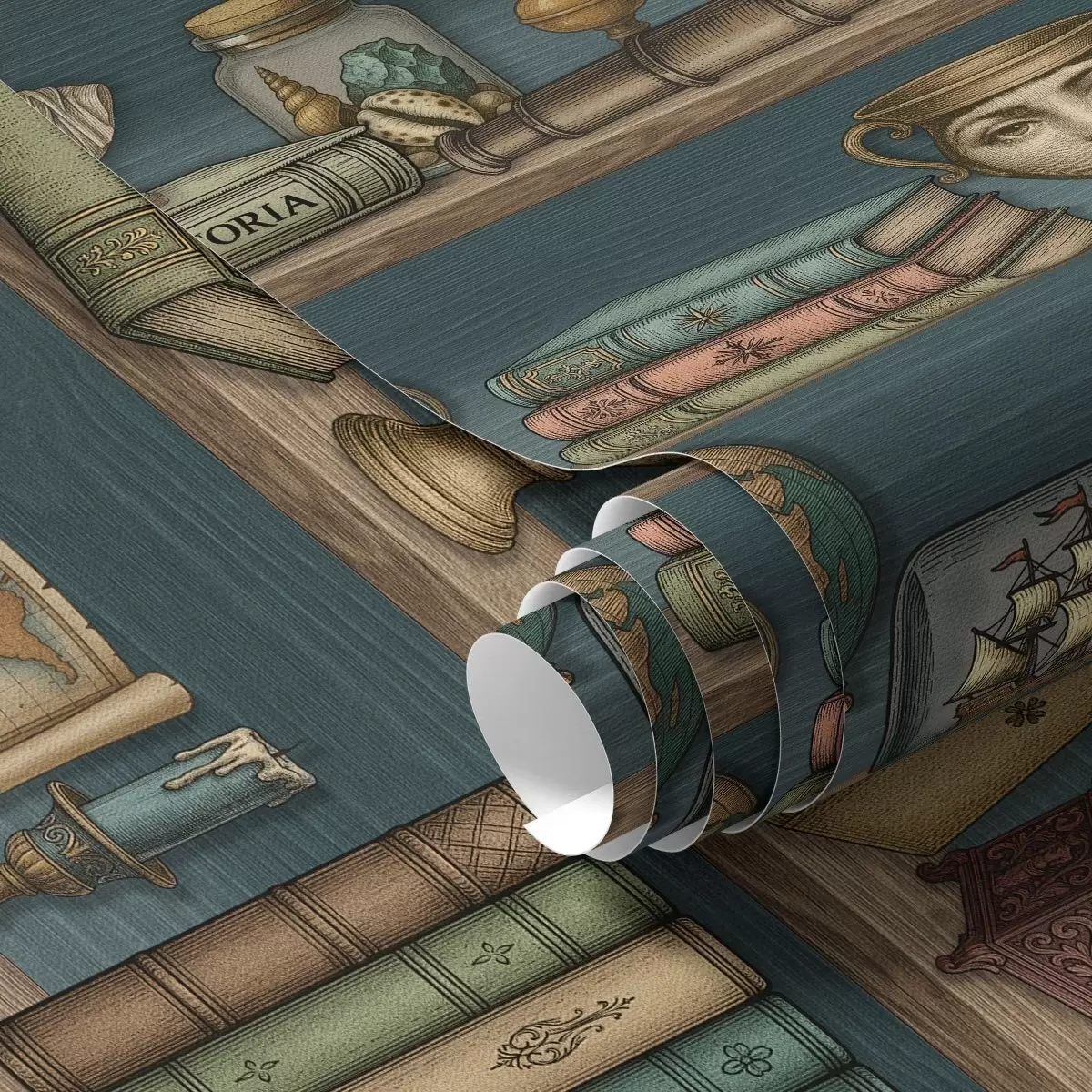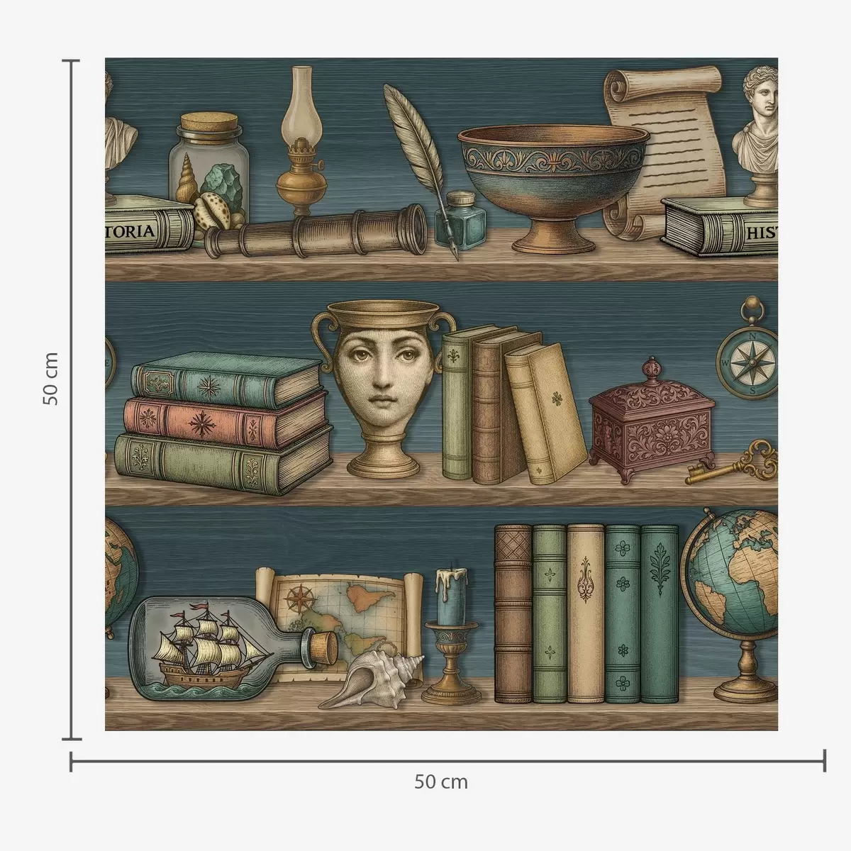 Tapeta Vintage police s knihami, glóbusem a mořskými kuriozitami Nr. a01036