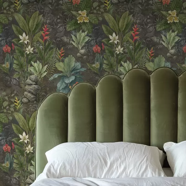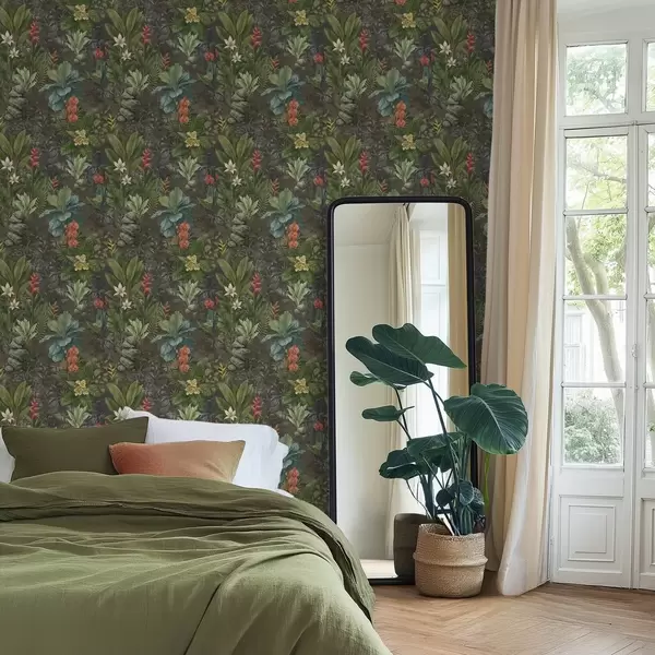 Tapeta Temná tropická zahrada s jasnými květinami a listovím Nr. a01079