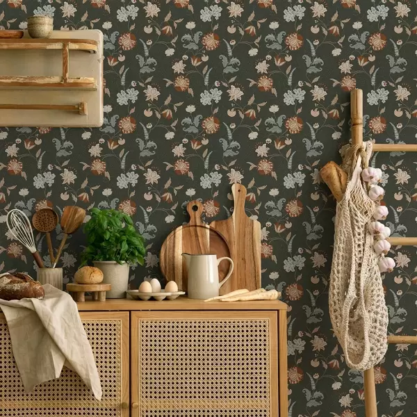 Tapeta Tmavě zelené pozadí s ozdobnými květinami a listy Nr. a01086